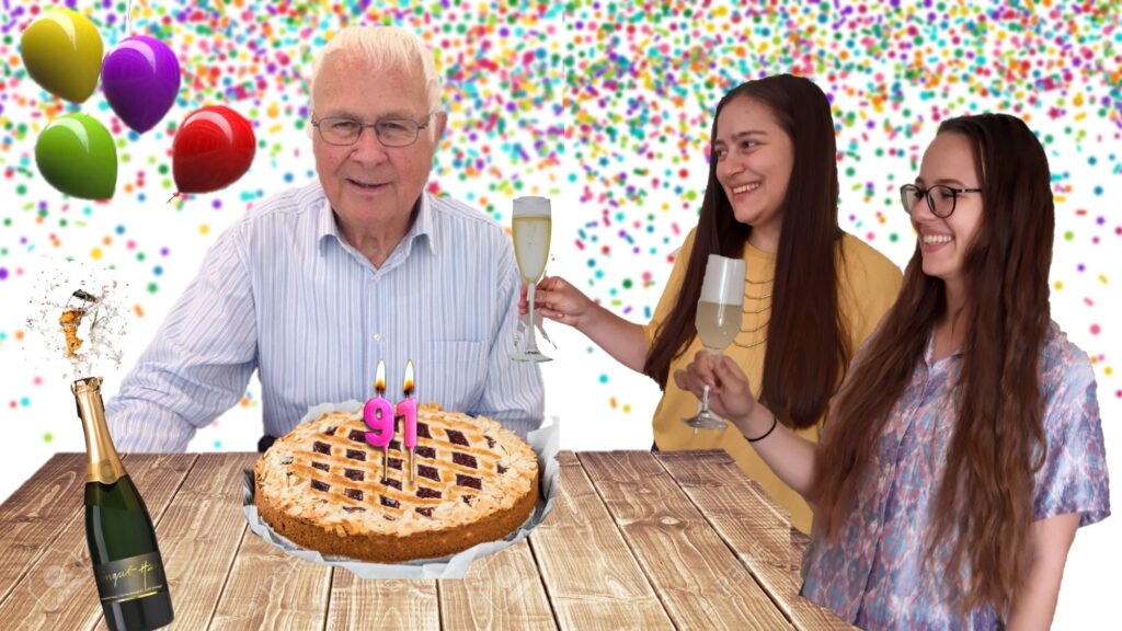 Zu deinem 91. Geburtstag wünschen wir Dir nur das Beste! Gerne stossen wir heute auf Dich an (zumindest virtuell, siehe Karte) und hoffen, dass Du diesen Tag auch geniessen kannst. Danke, dass Du auf so liebevolle und aufmerksame Art für uns da bist.